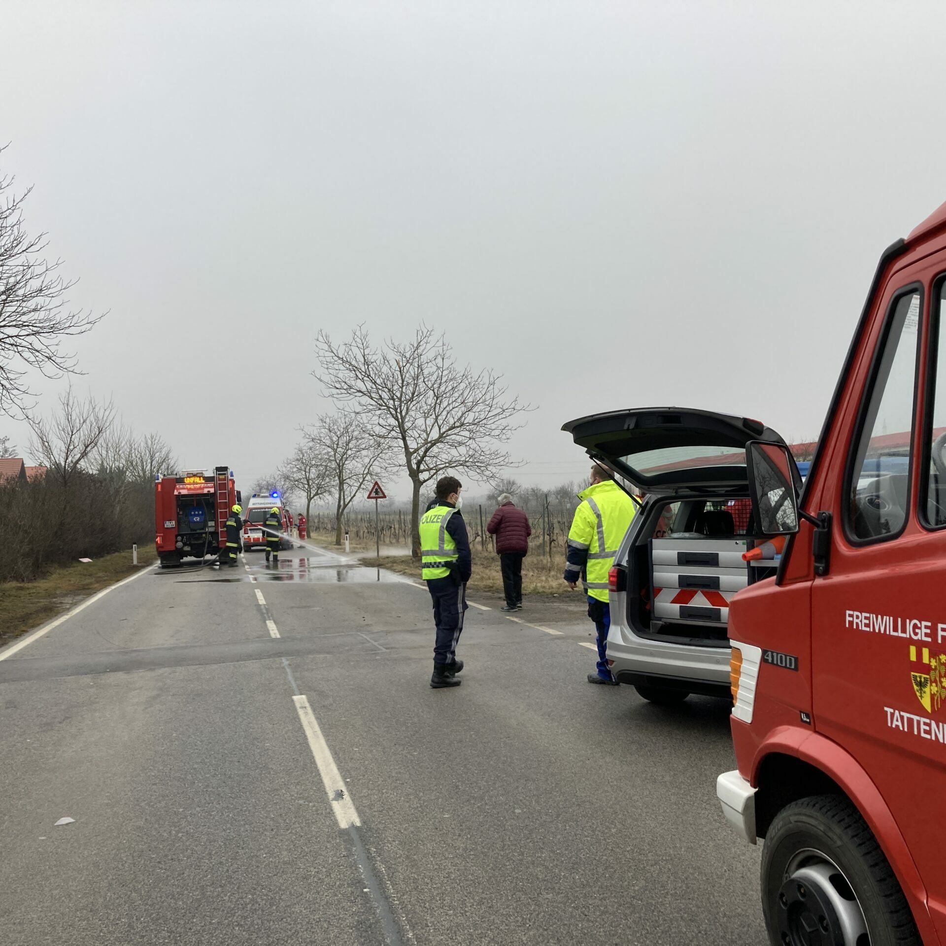 Am 22.02.2021 wurden die FF Tattendorf zu einem Verkehrsunfall zwischen zwei Fahrzeugen alarmiert. Auf Höhe des Burgunderwegs eignete sich ein Zusammenstoß zwischen zwei PKWs wodurch eine Person leicht verletzt wurde. Nachdem die Einsatzkräfte an der Unfallstelle eingetroffen sind wurde diese abgesichert und Brandschutz hergestellt. Die verunfallten Fahrzeugen wurden von der Fahrbahn verbracht und anschließend die Fahrbahn gereinigt. Um 10:30 konnten wir wieder ins FF-Haus einrücken und Einsatzbereitschaft herstellen.